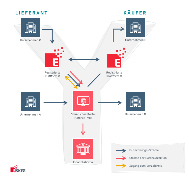 Beide Meldemodelle sind in einem Y-Modell erfasst, dass alle relevanten Meldeströme aufzeigt. Dabei bleibt es den Unternehmen überlassen, ob Sie einen offiziell registrierten Dienstleister für die Kommunikation mit Chorus Pro nutzen oder die Plattform eigenständig betreuen.