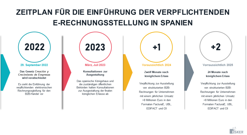 Bereits im September des letzten Jahres wurde das Gesetz „Crea y crece“ beschlossen, welches im Dezember in seiner jetzigen Fassung veröffentlicht wurde. Neben vielen anderen Aspekten zur Modernisierung und Digitalisierung in Spanien sieht das Gesetz auch die Einführung der obligatorischen E-Rechnung für den B2B-Bereich vor. Im B2G gibt es bereits seit 2015 Verpflichtungen zur Nutzung der E-Rechnung, nun werden die Verpflichtungen ausgeweitet. „Crea y Crece“ setzte eine Frist von 6 Monaten ab der Veröffentlichung, um einen Entwurf für die Umsetzung der Verpflichtung zu erstellen.