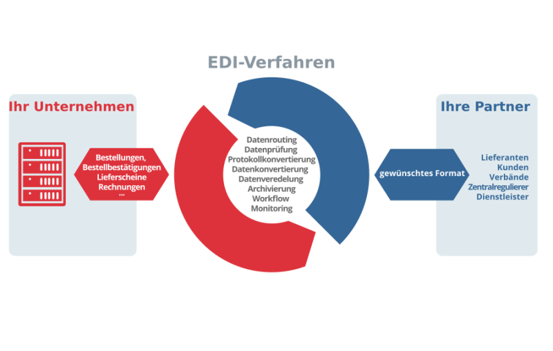 Um diesen „Normalfall“ abzudecken, wird bei der Einrichtung einer EDI-Verbindung zwischen zwei Partnern auch die notwendige Konvertierung eingerichtet. Bei dieser Konvertierung wird das Absender-Format in ein standardisiertes EDI-Format (bildlich: ein „EDV-Esperanto“) umgewandelt. Der Empfänger seinerseits wandelt das Standardformat in das Format seines ERP um. So ist eine Kommunikation zwischen vielen Geschäftspartnern unabhängig von deren ERP gewährleistet! Die EDI-Verbindungen und -Schnittstellen werden oft von Dienstleistern betrieben – auch die e-integration ist ein solcher.