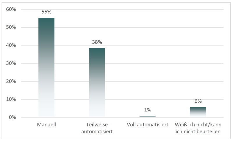 Knapp zwei Drittel der Umfrageteilnehmenden (65 %) gaben an, dass ihnen der Begriff „Claims & Deductions“ bereits im Vorfeld der Umfrage bekannt war. Die Bearbeitung des damit verbundenen Prozesses erfolgt derzeit in mehr als der Hälfte der befragten Unternehmen (55 %) noch manuell. Weitere 38 Prozent haben die Bearbeitung zumindest teilweise automatisiert. Bei lediglich einem Prozent der Unternehmen erfolgt die Bearbeitung voll automatisiert (vgl. nachfolgende Grafik).