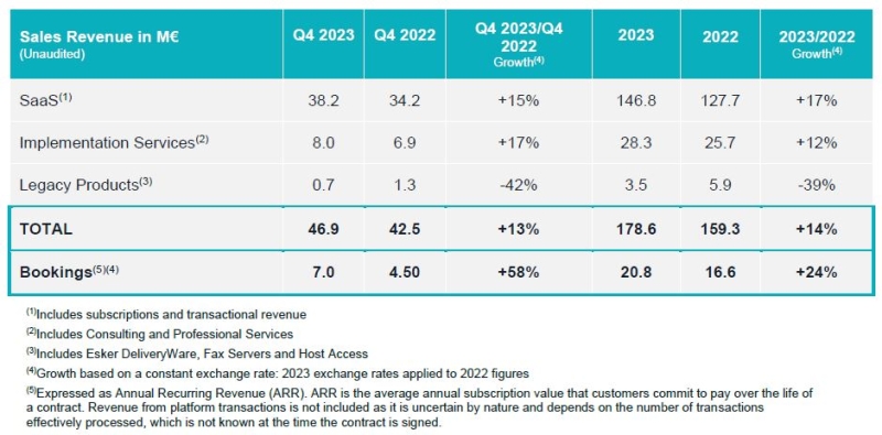 Esker also recorded its best quarter in terms of new bookings. The annual recurring value (ARR) of new contracts signed during Q4 2023 increased by 58% based on constant exchange rates compared to Q4 2022, reaching 7.0 million euros. This represents 38% growth compared to the previous record in Q3 2023.