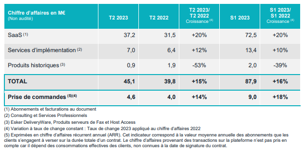 Esker réalise, une nouvelle fois, le meilleur trimestre et le meilleur semestre de son histoire. Sur ce 2ème trimestre, le chiffre d’affaires SaaS (+20% à taux de change constants et +18% en données publiées) tire la croissance du Groupe pour représenter 82% de l’activité. Cette excellente performance est le fruit des nombreux contrats clients signés au cours des précédents trimestres qui entrent progressivement en production. Par ailleurs, les volumes de transactions ont montré une belle résilience depuis le début de l’année.