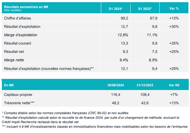 La trésorerie nette du Groupe (après déduction des dettes financières) s’élève à 48,2 M€, en hausse de +5,6 M€ après le versement d’un dividende représentant 26% du résultat net de l’année 2023. L’évolution positive du niveau de trésorerie est la conséquence de la très bonne génération de cash d’exploitation sur le semestre, en progression de près de +1,8 M€, soit +13% par rapport au 1er semestre 2023.