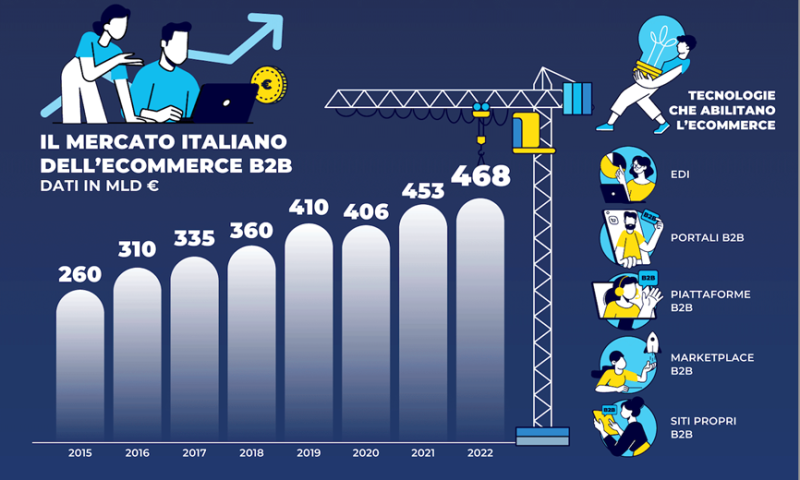 Secondo i più recenti dati dell’Osservatorio Digital B2B del Politecnico di Milano, lo scenario italiano degli scambi B2b, in generale trend di crescita, oggi è una medaglia a doppia faccia: da un lato emerge un livello di adozione mediamente alto delle tecnologie per le transazioni digitali (tra EDI, Portali B2b e Piattaforme B2b, Marketplace B2b e siti propri B2b), dall’altro si conferma una ancora bassa penetrazione dell’eCommerce B2b, con appena un ordine su cinque scambiato tramite strumenti digitali. In generale, tra i processi amministrativo-contabili delle imprese, le attività interne sono le più digitalizzate, ma il livello raggiunto non è ancora soddisfacente, complice la bassa digitalizzazione delle pmi.