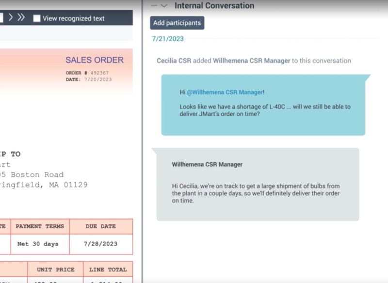 È infine possibile richiedere informazioni sugli ordini prima dell’evasione, tramite conversazioni tracciate direttamente sull'ordine. In questo modo è possibile collaborare sia con i clienti che con i colleghi tramite conversazioni via e-mail o chat avviate dalla piattaforma. L'intera cronologia delle conversazioni associate a ciascun ordine viene tracciata, promuovendo un approccio di comunicazione incentrato sul cliente.