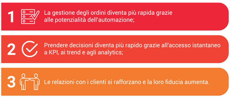 In generale, riassumendo, i vantaggi operativi della soluzione Esker di gestione ordini clienti si estendono su ogni aspetto del processo di ordine: