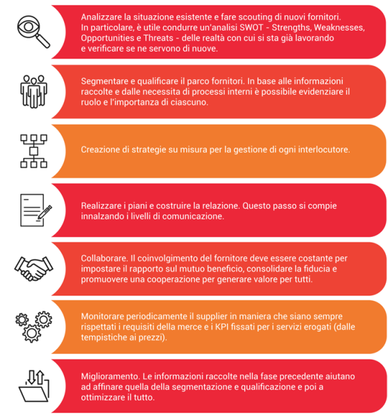 Con supplier (relationhip) management si intendono tutti i processi utili a creare, mantenere e ottimizzare le relazioni con i fornitori. Vi sono vari passaggi da effettuare per costruire il network di riferimenti per gli acquisti su cui un’organizzazione basa il proprio operato. Vediamoli nel dettaglio.