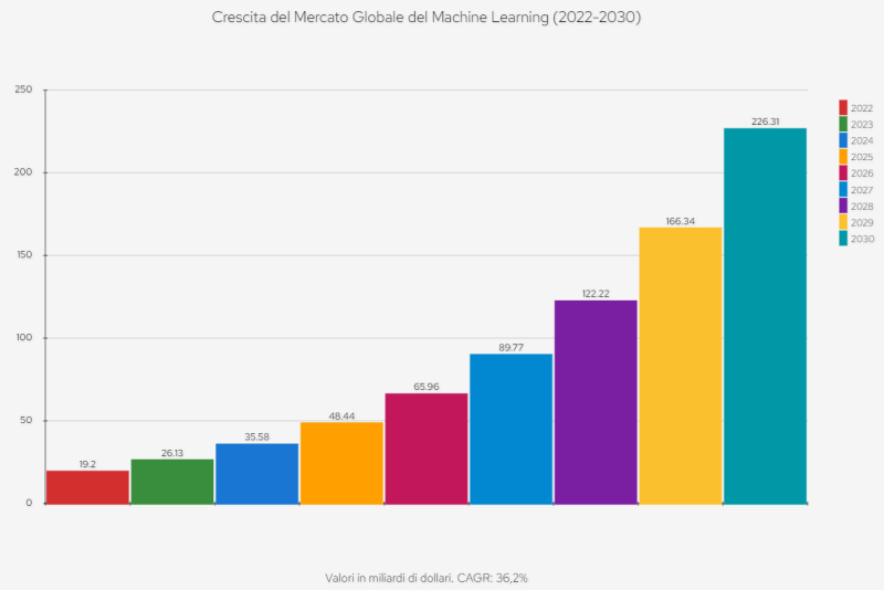 Secondo un recente studio di Fortune Business Insights, il mercato globale del machine learning è stato valutato a 19,20 miliardi di dollari nel 2022 e si prevede che raggiungerà i 225,91 miliardi di dollari entro il 2030, con un tasso di crescita annuo composto (CAGR) del 36,2%.