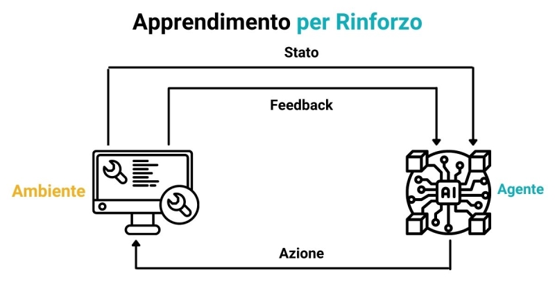 Nell'apprendimento per rinforzo (RL o Reinforcement Learning) l’algoritmo (o agente) impara grazie all’interazione con l'ambiente circostante attraverso meccanismi di feedback per "trial-and-error", senza alcuna conoscenza a priori di come le sue azioni influenzino l'ambiente o di quali obiettivi debba perseguire.