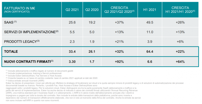 Il fatturato del Q2 2021 di Esker ammonta a 33,4 milioni di euro, registrando un aumento del 32% rispetto al Q2 2020 a tasso di cambio costante (+28% a tasso corrente). Il fatturato semestrale è cresciuto del 22% a tasso di cambio costante (19% a tasso di cambio corrente) attestandosi a 64,4 milioni di euro. Esker ha vissuto nuovamente il suo trimestre e semestre di maggior successo nella storia dell’azienda.