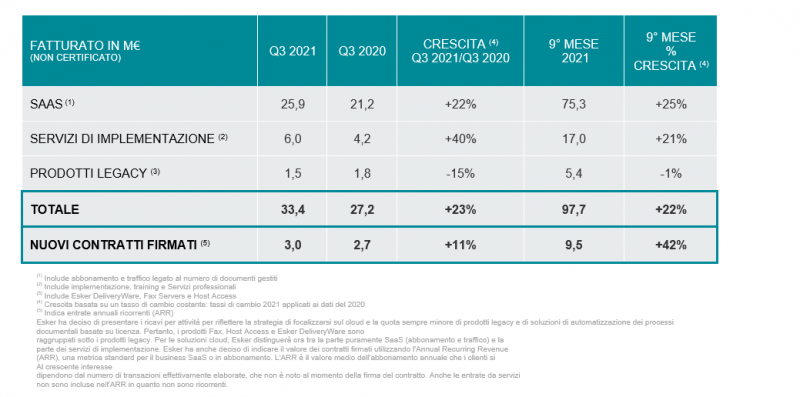 Il Valore Annuale Ricorrente (ARR) dei nuovi contratti firmati nel Q3 2021 è stato di 3,0 milioni di euro (11,6 milioni di euro sulla durata totale dei contratti), in aumento dell’11% rispetto allo stesso trimestre dello scorso anno perché ha beneficiato della forte ripresa economica dopo la prima ondata della pandemia.