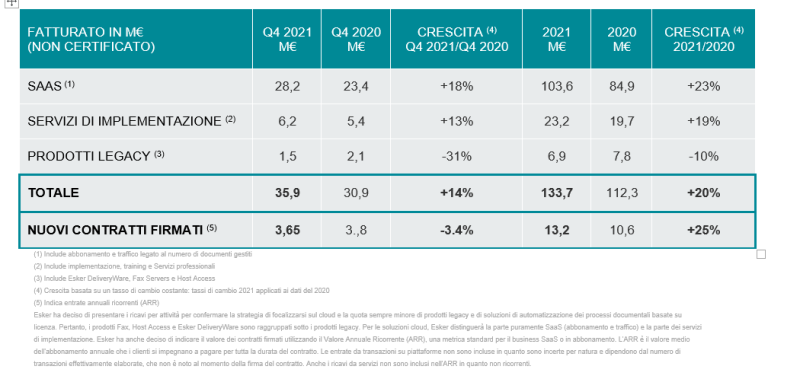 Per l'intero anno 2021, il valore annuale ricorrente dei contratti firmati è stato di 13,2 milioni di euro, in aumento del 25% rispetto al 2020. Il valore totale dei contratti firmati nel corso del 2021 è stato di 48 milioni di euro rispetto ai 34,7 milioni di euro del 2020, con un aumento del 38%.
