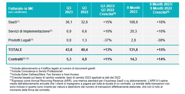 Il fatturato consolidato del Q3 2023 è stato di 43,8 milioni di euro, in crescita del 13% a tassi di cambio costanti (+8% tassi di cambio correnti) rispetto allo stesso trimestre dell'anno precedente. Il fatturato dei primi nove mesi dell'anno si attesta a 131,6 milioni di euro, in crescita del 15% a tassi di cambio costanti (+13% tassi di cambio correnti).